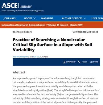 (通讯员:交通研究中心)近日,我院白桃老师在美国土木工程师协会American Society ofCivil Engineers(ASCE)下属InternationalJournal of Geomechanics期刊发表上最新科研成果《Practice of searching anoncircular critical slip surface in a slope with soil variability》(DOI:10.1061/(ASCE)GM.1943-5622.0001350, JCR2区,IF=2.66)。